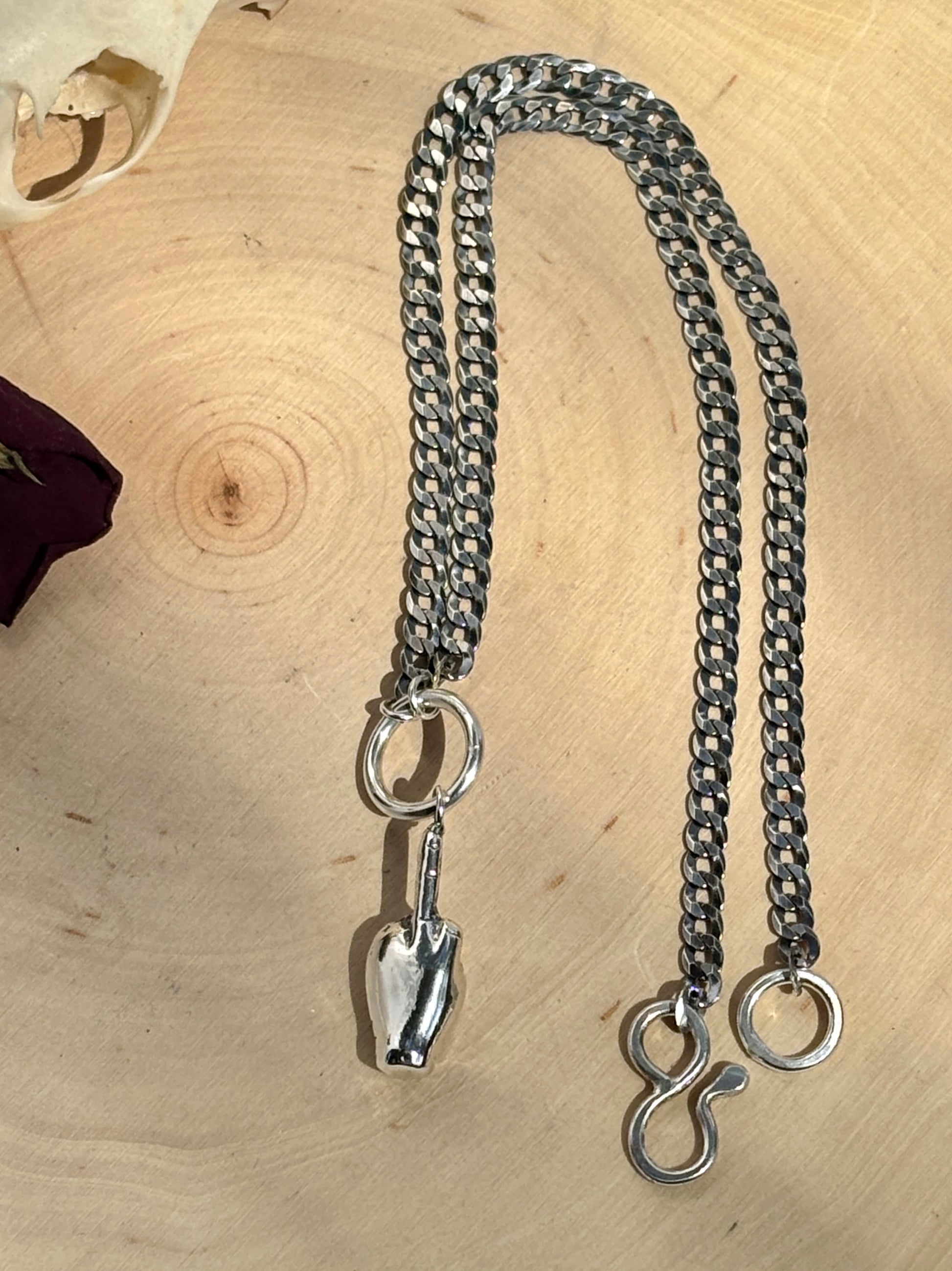 Unleash your attitude with our Chunky Middle Finger necklace. Made of sterling silver, it features a bold middle finger charm on a chunky curb chain. At 16'' long, it's perfect for making a statement.