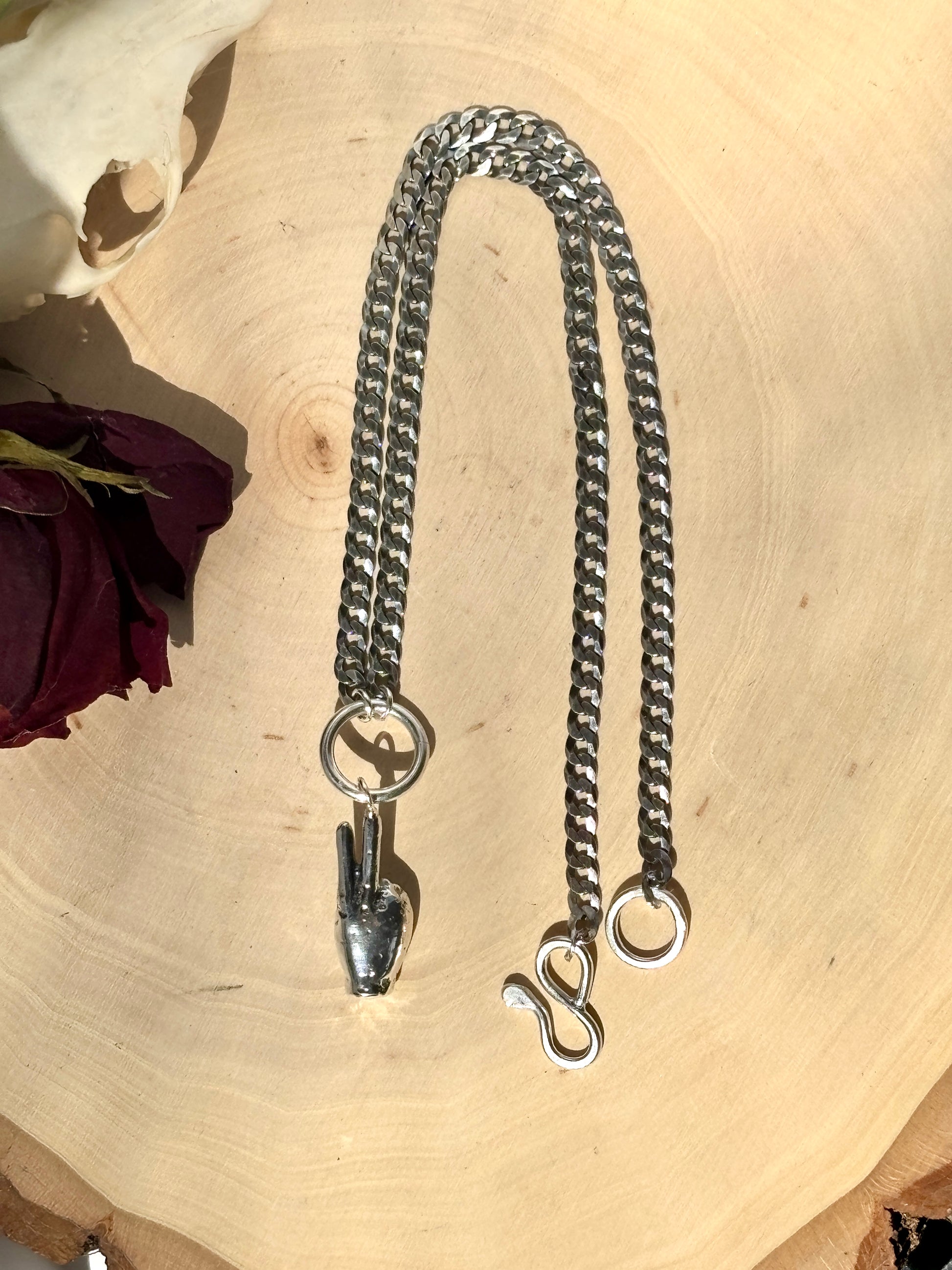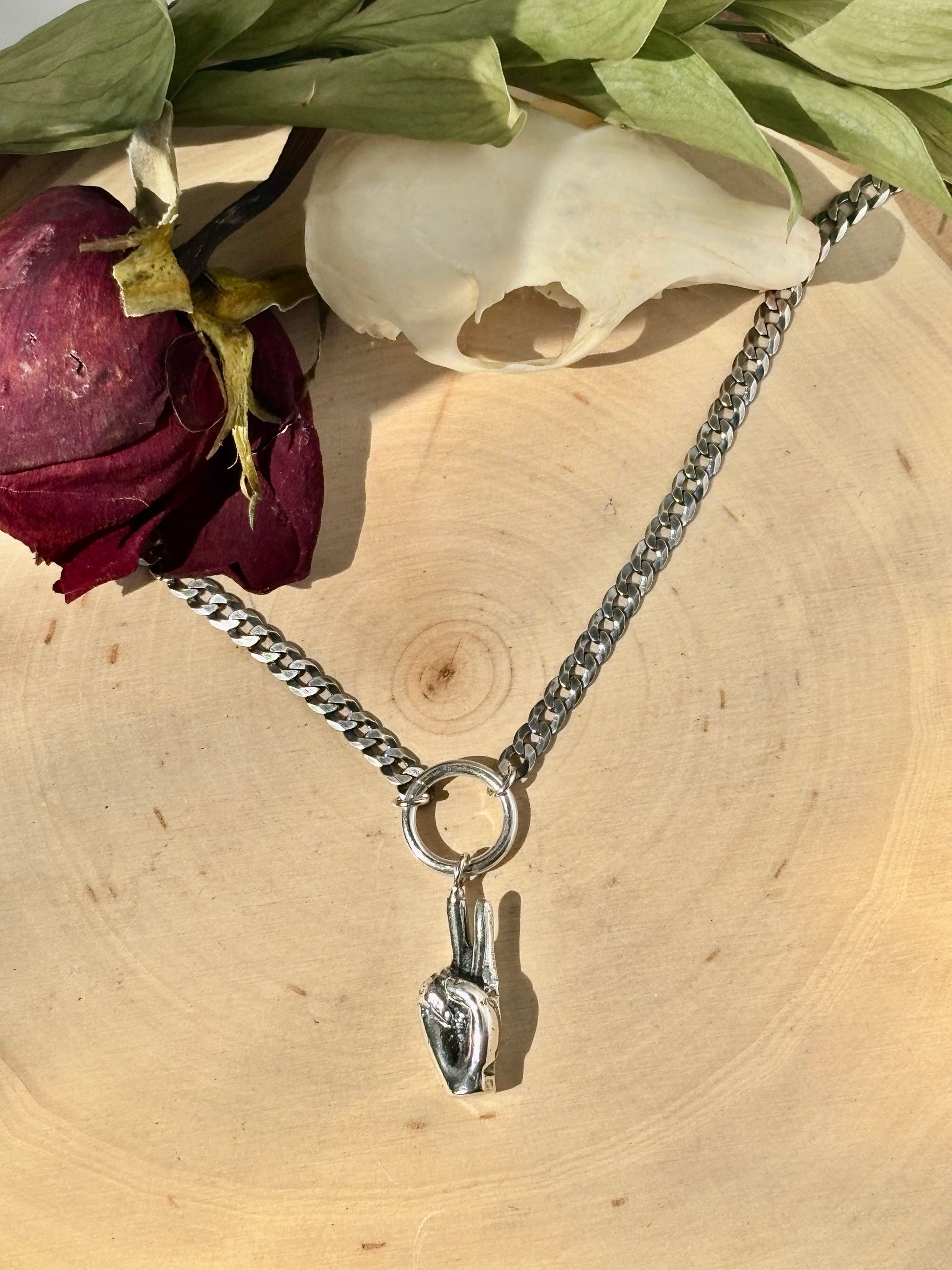 Spread peace and love with our Chunky Peace Sign necklace. Featuring a sterling silver peace sign hand pendant on a chunky curb chain, this 16 inch accessory adds unique style to any outfit.