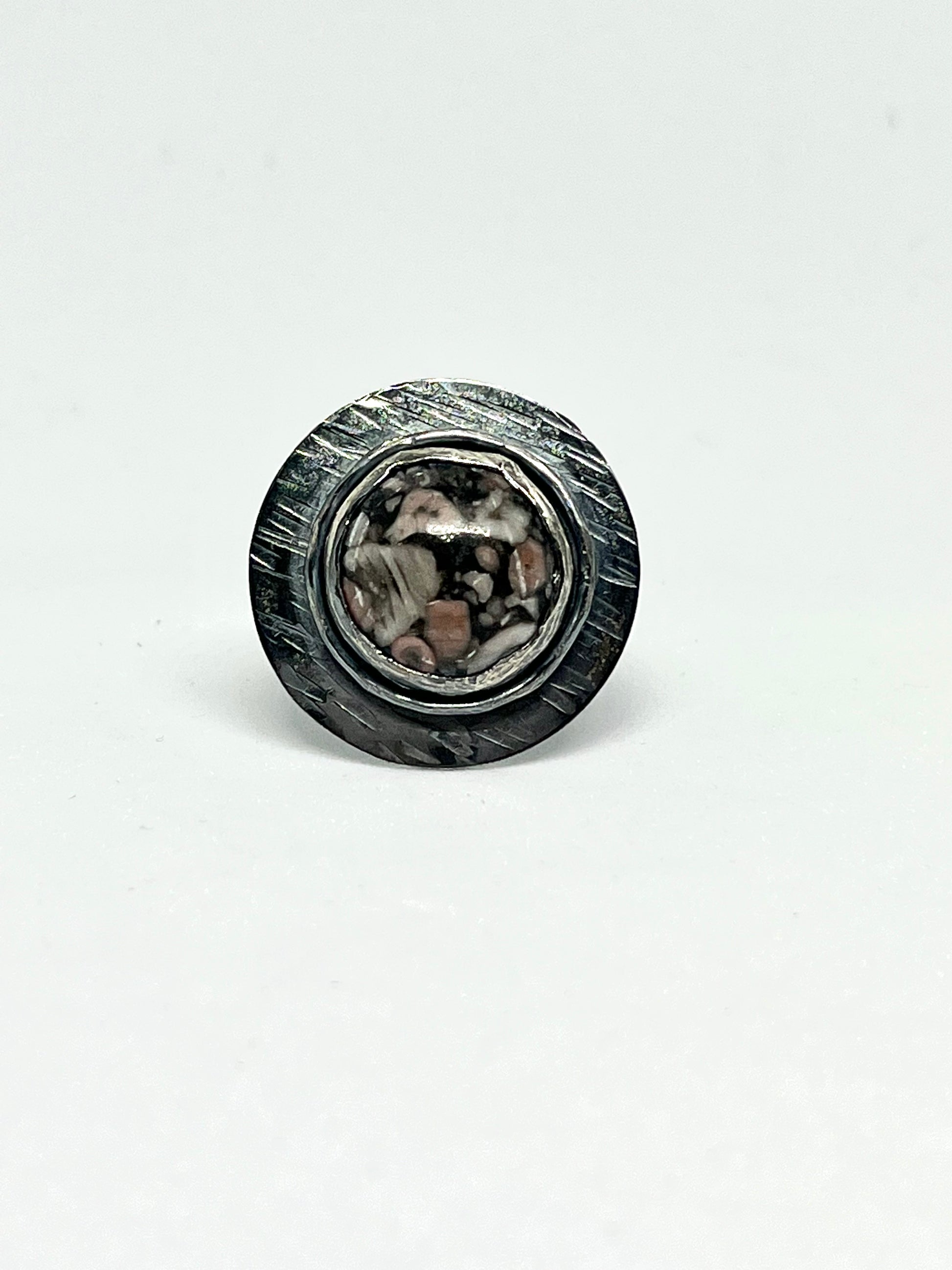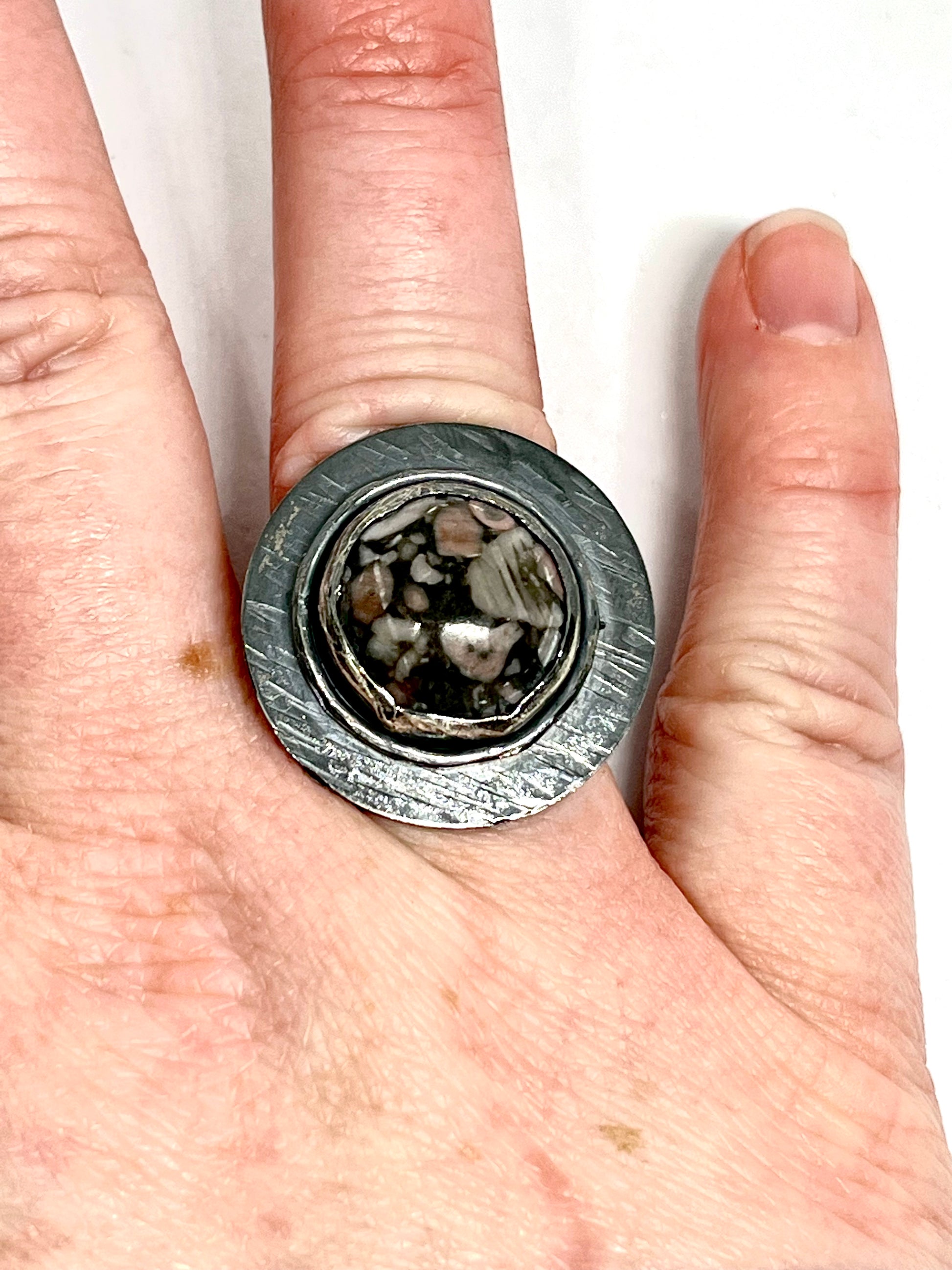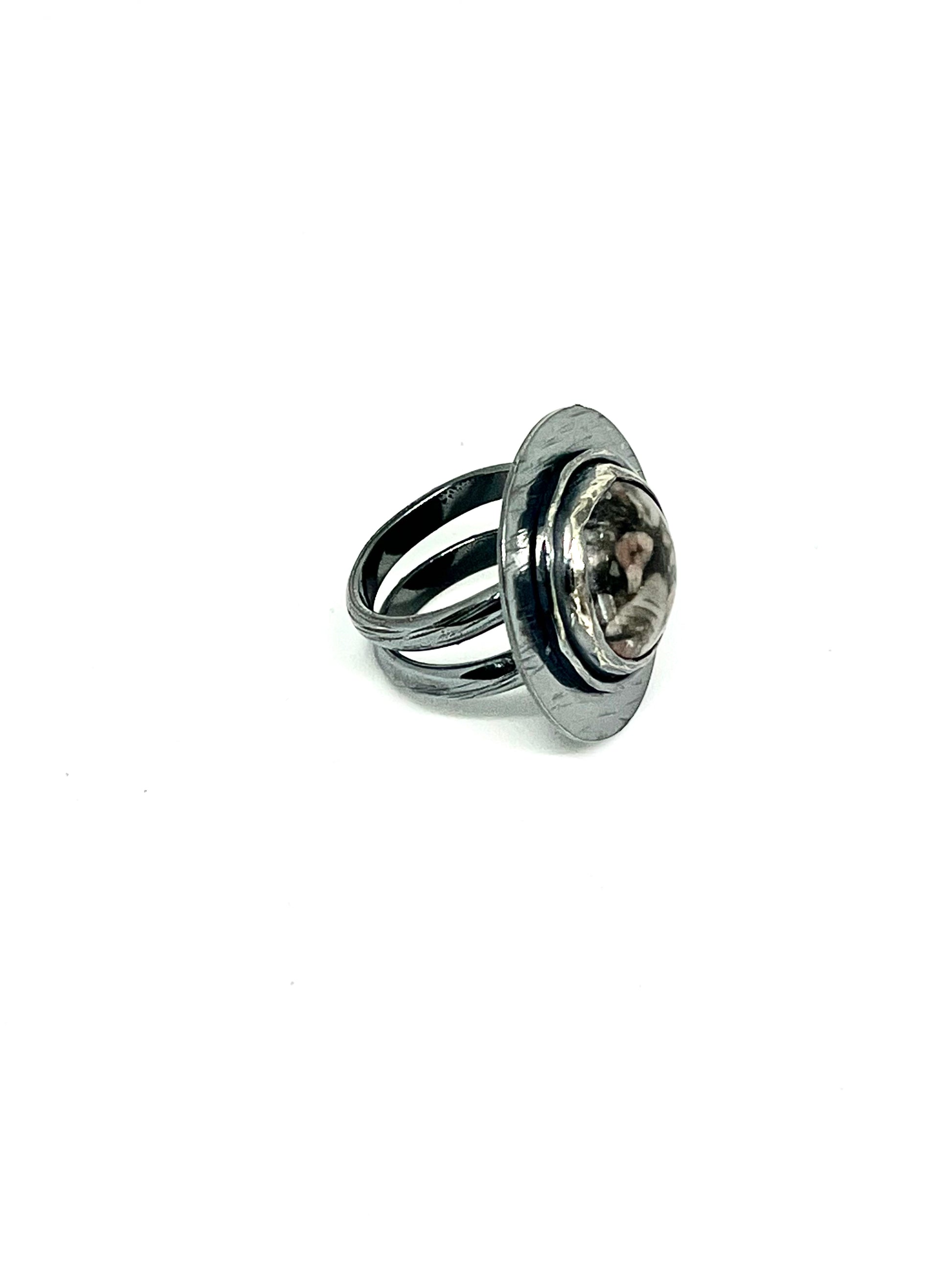 Let your fingers do the talking with this distinctive double-banded ring! Featuring a textured disc and an eye-catching Ocean Jasper stone, this ring is sure to make a bold statement.