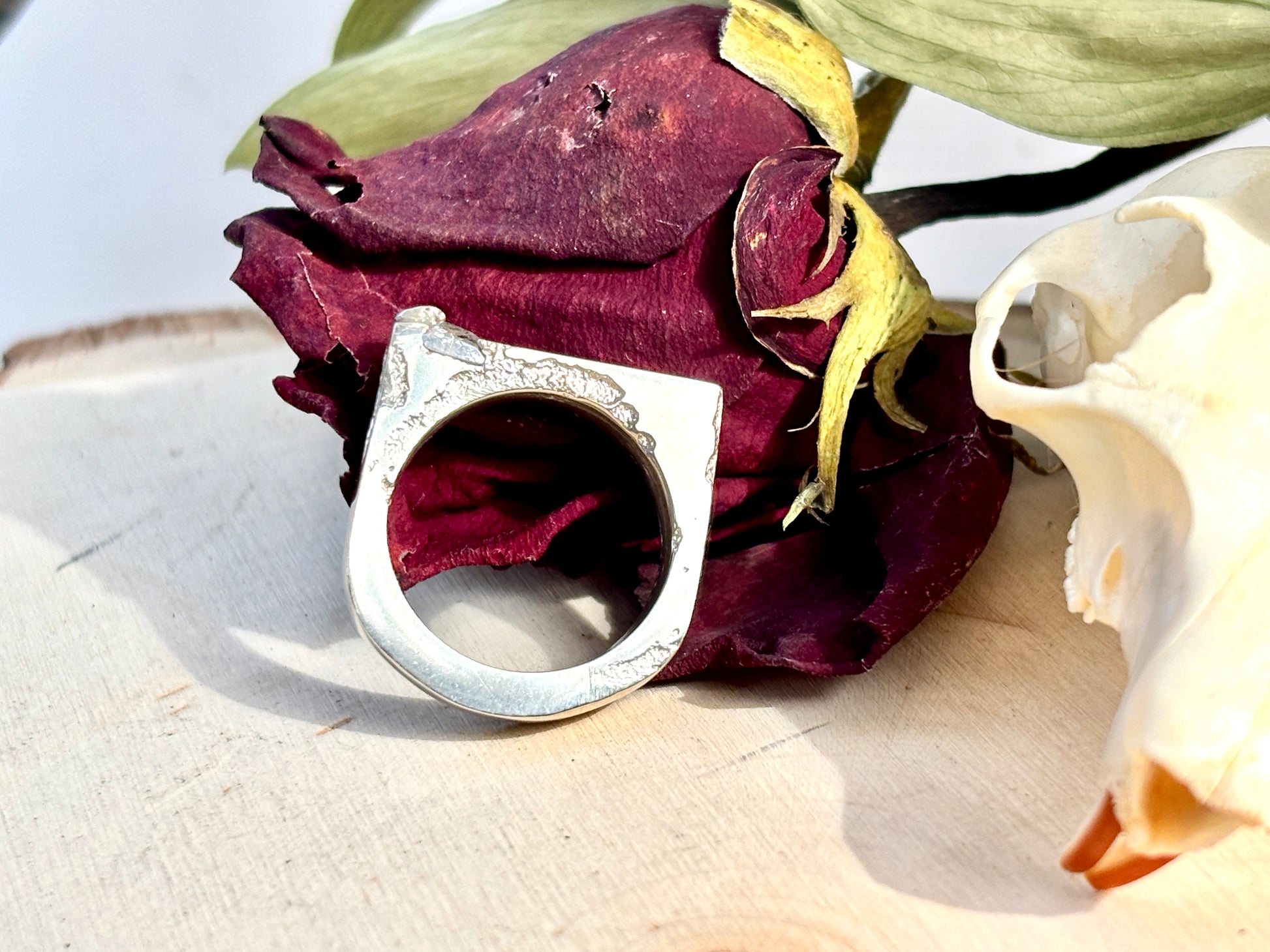 This Signet Ring is made of solid sterling silver and features a dazzling cubic zirconia, has an organic and distinctive appearance. Its unique design adds a touch of individuality.