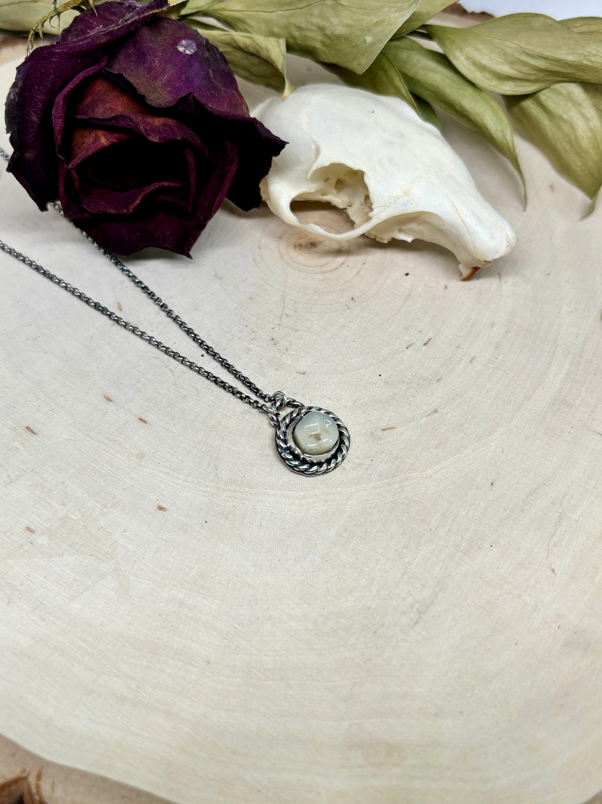 This necklace features resin tooth pendant suspended from a 22-inch sterling silver chain. The tooth is framed with delicate twist wire detail.
